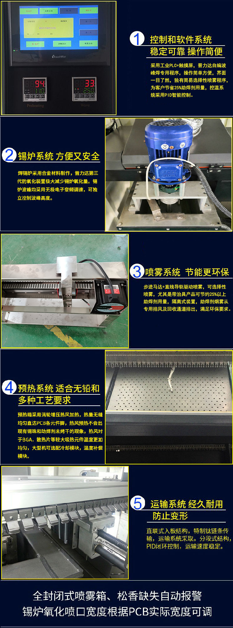 4、錫爐加熱采用高速PID外熱式兩段獨(dú)立控制,升溫迅速,解決了錫爐暴錫,耗電大的缺點(diǎn)