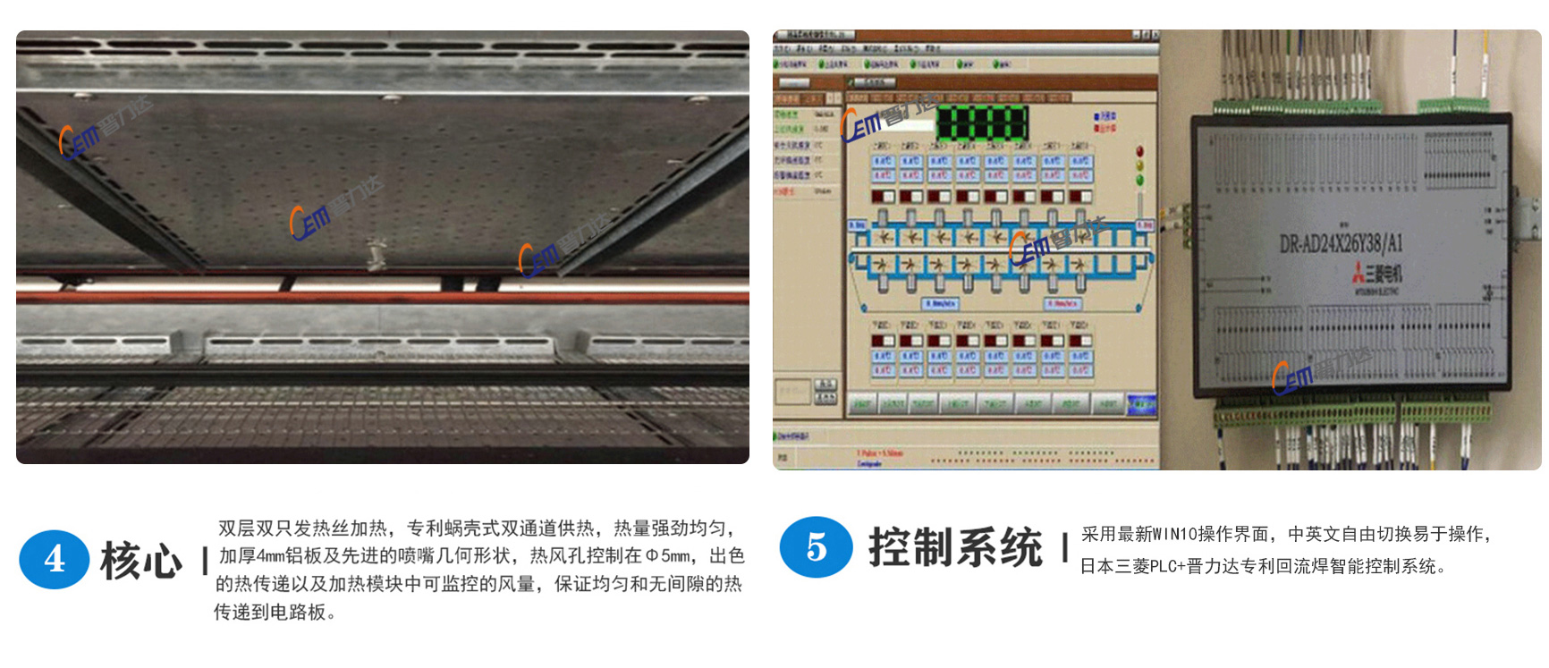 ● 各溫區采用強制獨立循環,獨立PID控制,上下獨立加熱方式,使爐腔溫度準確,均勻,熱容量大;獨特的雙熱風通道加熱方式, 快速熱補償,高制程能力,解決了回流焊焊接時的死角難題.適合CSP、BGA、0201CHIP等電器元件的焊接.
